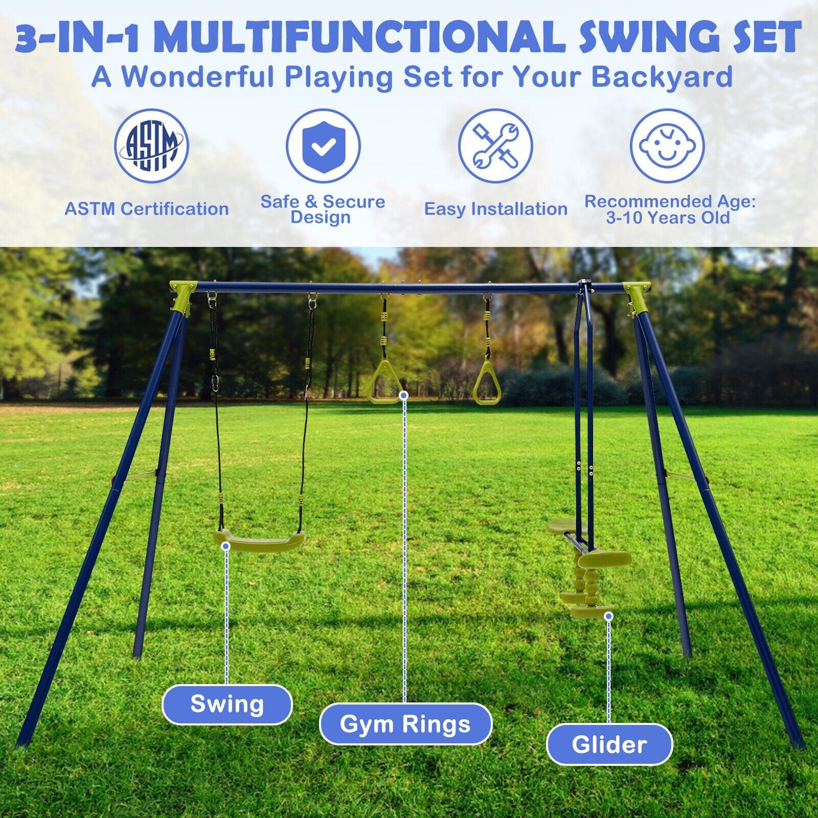 ● 3-in-1 Multifunctional Swing Set: Combining multiple playing ways this outdoor swing set aims to create endless fun for your little one and accompany them as they grow up. Designed with a U-shaped swing a 2-person glider and 2 gym rings this kid's swing set can accommodate 4 kids to play at the same time.