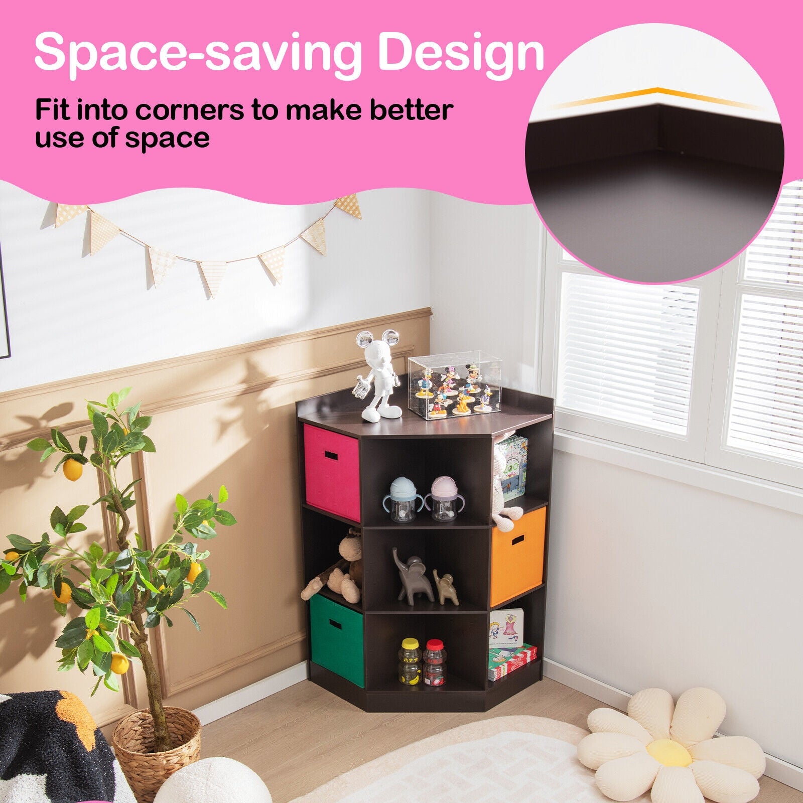 3-Tier Kids Storage Shelf Corner Cabinet with 3 Baskets-Brown