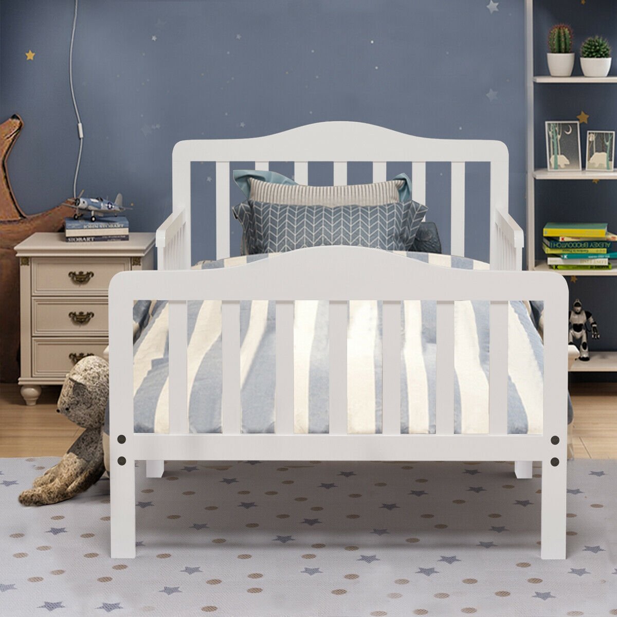 Classic Design Kids Wood Toddler Bed Frame with Two Side Safety Guardrails-White