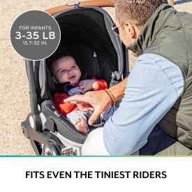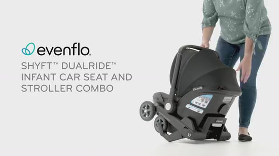Shyft into life with a newborn! The Evenflo® Shyft™ DualRide™ Infant Car Seat Stroller Combo with Carryall Storage & Extended Canopy is a single piece of baby gear that Shyfts from infant car seat to stroller in one step, streamlining life on the go. Moving from car to sidewalk? Simply lift the carrier off the base, release the wheels and you’re rolling in no time. From backseat to street in a heartbeat! Maneuvering stairs? Retract the wheels, carry up or down steps, pop the wheels back down and stroll on. No struggling with multiple pieces of gear. No disturbing your little one. This car seat stroller combo makes every trip easier. Designed for infants as small as 3 lb and up to 35 lb, who measure from 15.7 in. to 32 in., this stroller with infant car seat in one comes with a no-rethread harness that adjusts to 8 positions to grow with your child. Thoughtful design places the infant carrier on the stroller higher, so your baby’s sweet face is always near. You’re looking for a safe infant car seat — and the smart car seat is a connected car seat. With SensorSafe™ to connect you to your little one from their car seat, the DualRide is the gold standard when it comes to child car seat safety. DualRide’s integrated SensorSafe technology alerts you in real-time to 4 potentially unsafe conditions from your child’s car seat either inside or outside of the car via Bluetooth: unexpected chest clip unbuckling, unsafe ambient temperature, child unattended, and child buckled too long. LockStrong™ Installation and Quick Connectors™ provide solid, secure installation in no time. Compatible with the Evenflo® Gold Shyft Travel System, this stroller car seat combo provides an extendable, full-coverage canopy to block rain and snow, with UPF 50+ to help protect against the sun — a built-in mesh peek-a-boo panel lets you keep an eye on your baby. With the DualRide stroller and infant car seat combo, the extras aren’t extra! A removable carryall storage bag and removable parent cupholder are included. Another plus: Wheels nest securely in the base wheel wells in your vehicle, so you can take just the carrier into your home without tracking in dirt. To finish it off, this DualRide features our most sophisticated silhouette and premium details, including vegan leather trim, chrome zippers and pulls, plus washable padding, to ensure you’ll Shyft into new parenthood in style. There are strollers and there are infant car seats — you get the best of both in the Shyft DualRide. The one piece of baby gear that does it all!