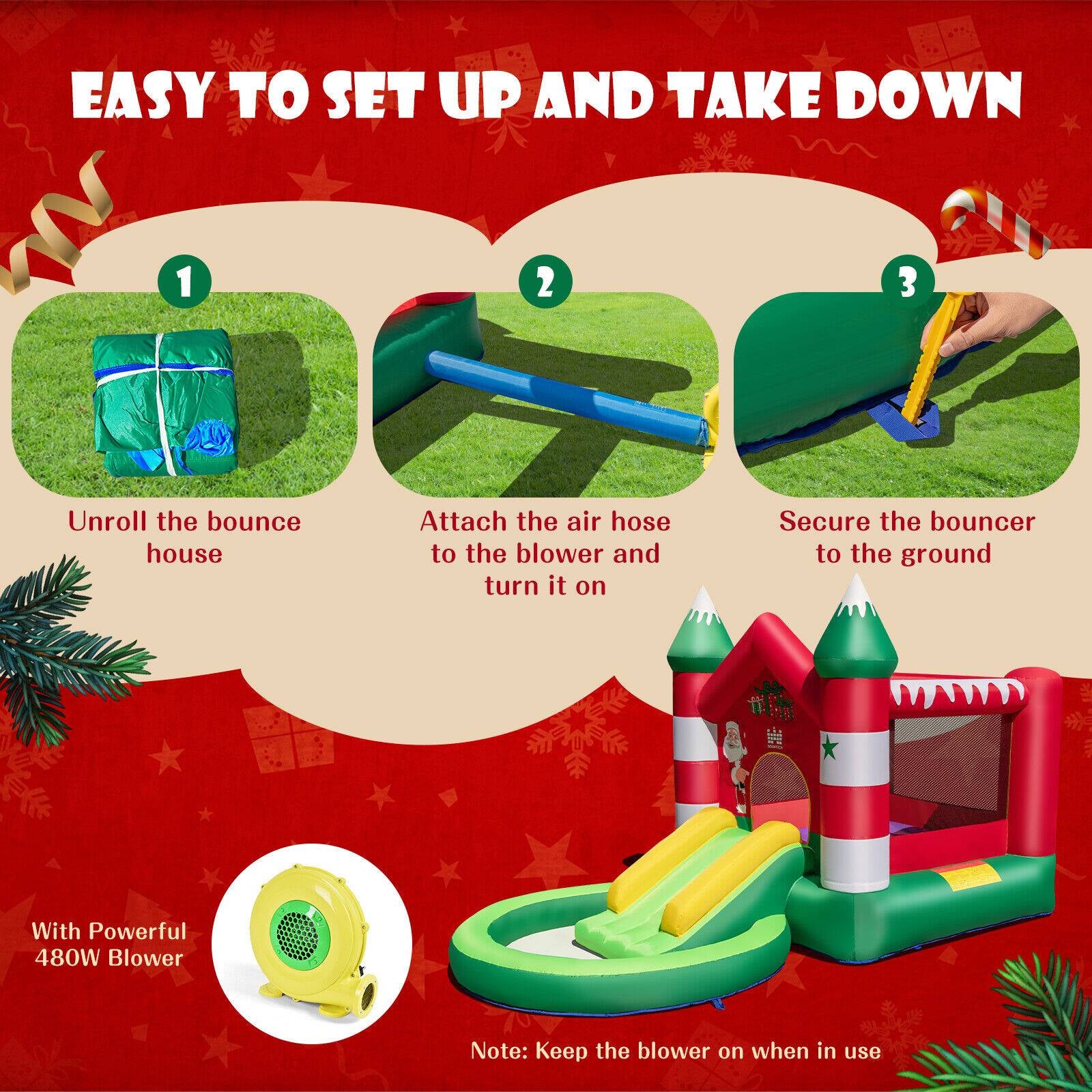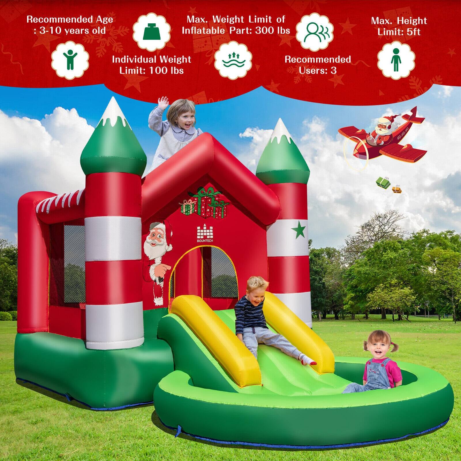● Typical Christmas-Themed Inflatable Castle: The bounce house is designed with Christmas-themed appearance of smiling Santa Claus and multi-colored gift boxes creating a happy festive atmosphere and making kids squeal with delight. Plus the white spires are very in line with the winter tones.