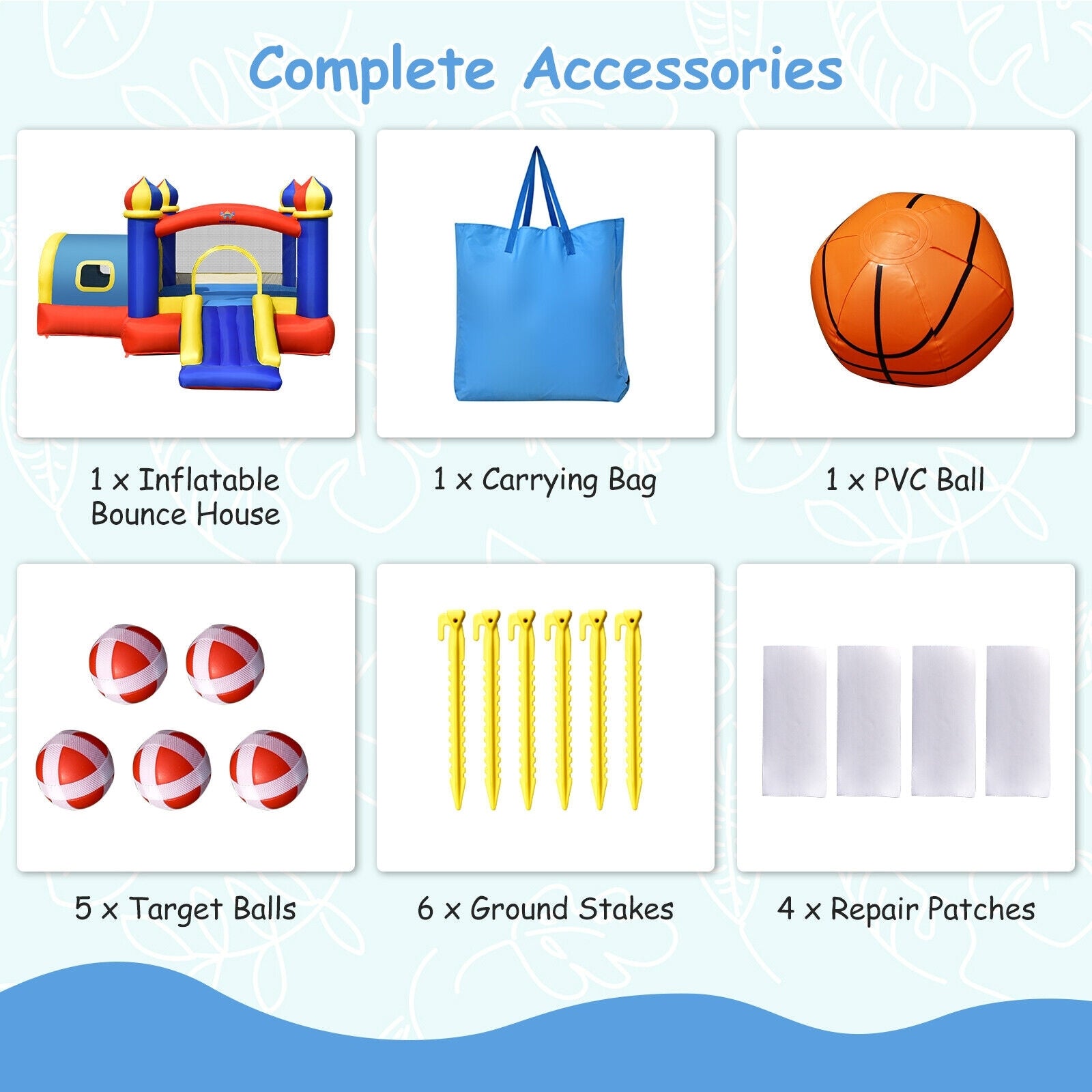 ● Multiple 5-in-1 Playing Areas: This bounce house comes with a smooth slide a large jumping area a challenging basketball rim a funny target game and a mysterious house for kids to play. Apart from more outdoor pleasure the inflatable castle greatly improves kids’ interests in outside sports and promotes intellectual development while playing.