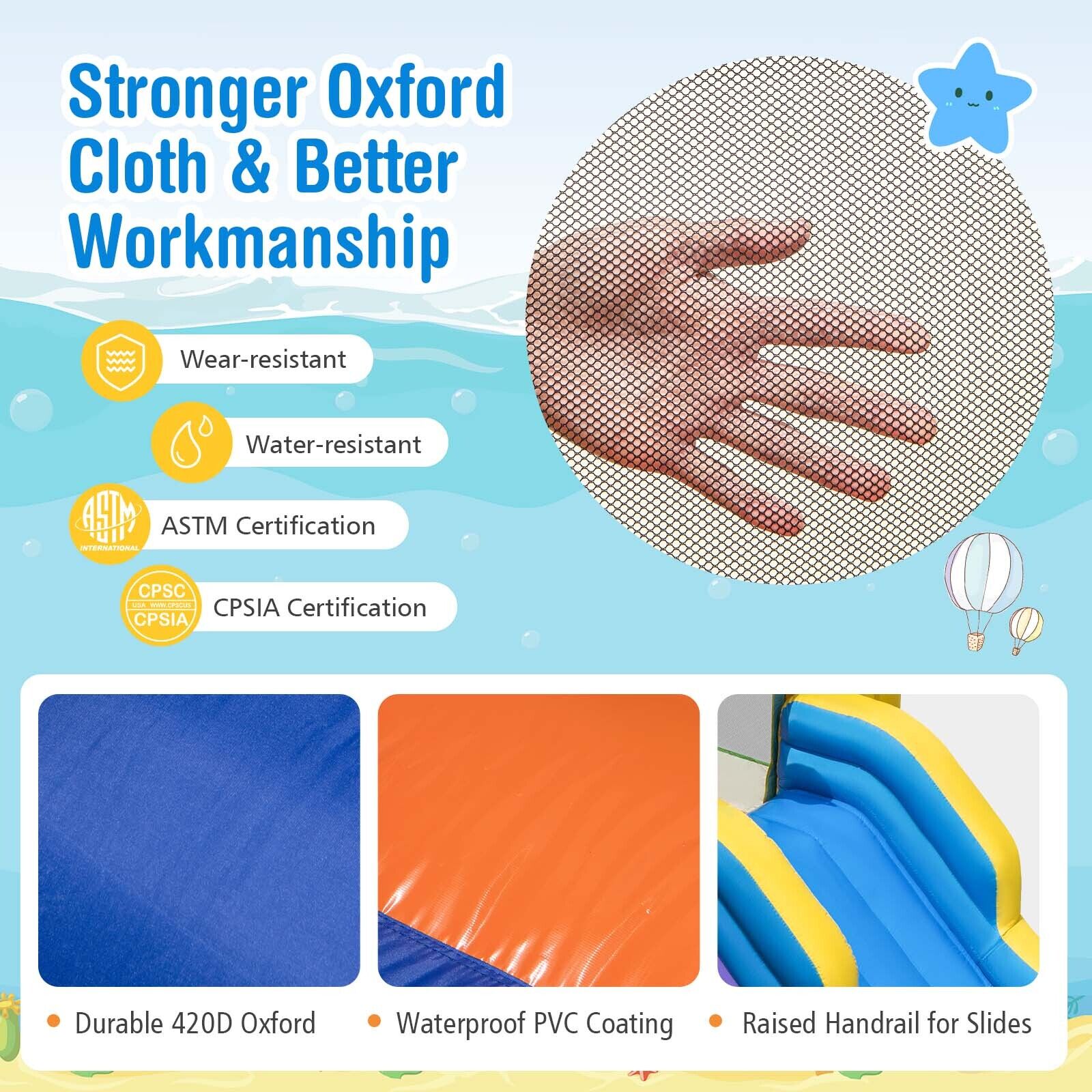 ● Durable Materials: This bouncy castle is made of high quality PVC and Oxford cloth which can provide long-time use. The surface of the jump area and slide are made of waterproof and wear-resistant PVC which can hold up to 198lbs. The chunky 420D Oxford cloth is not only wear-resistant crack resistant and color fixation but can also provide a soft and comfortable experience for your kids.