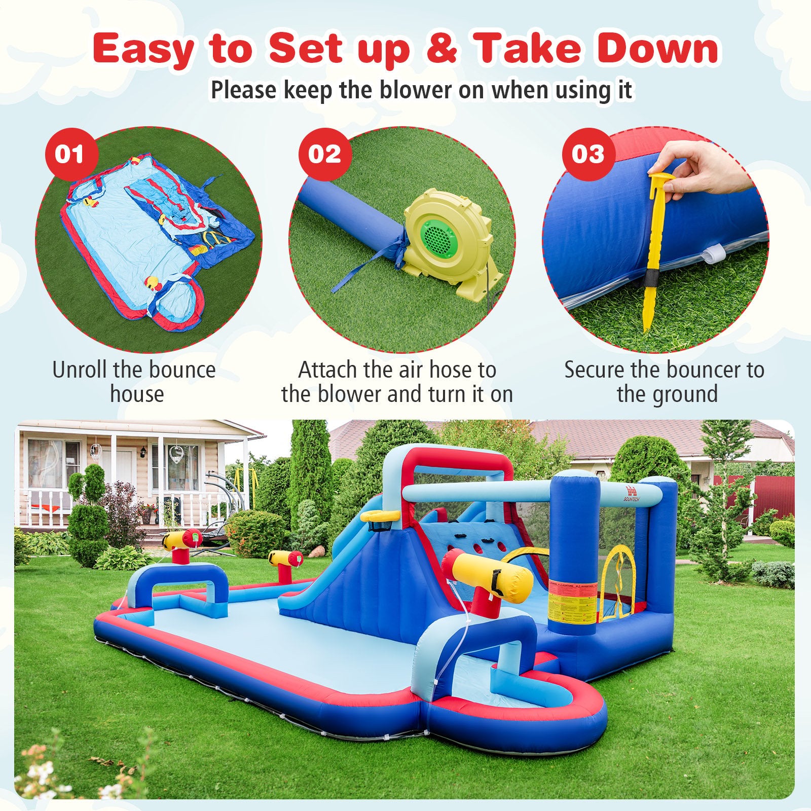● Wet and Dry Inflatable Bouncy: Just connect the hose the bounce house can be used as a multifunctional water slide. Kids can play in the splash pool to release their nature. More 3 water guns are designed for several kids to have competitive fun keeping them entertained for hours.