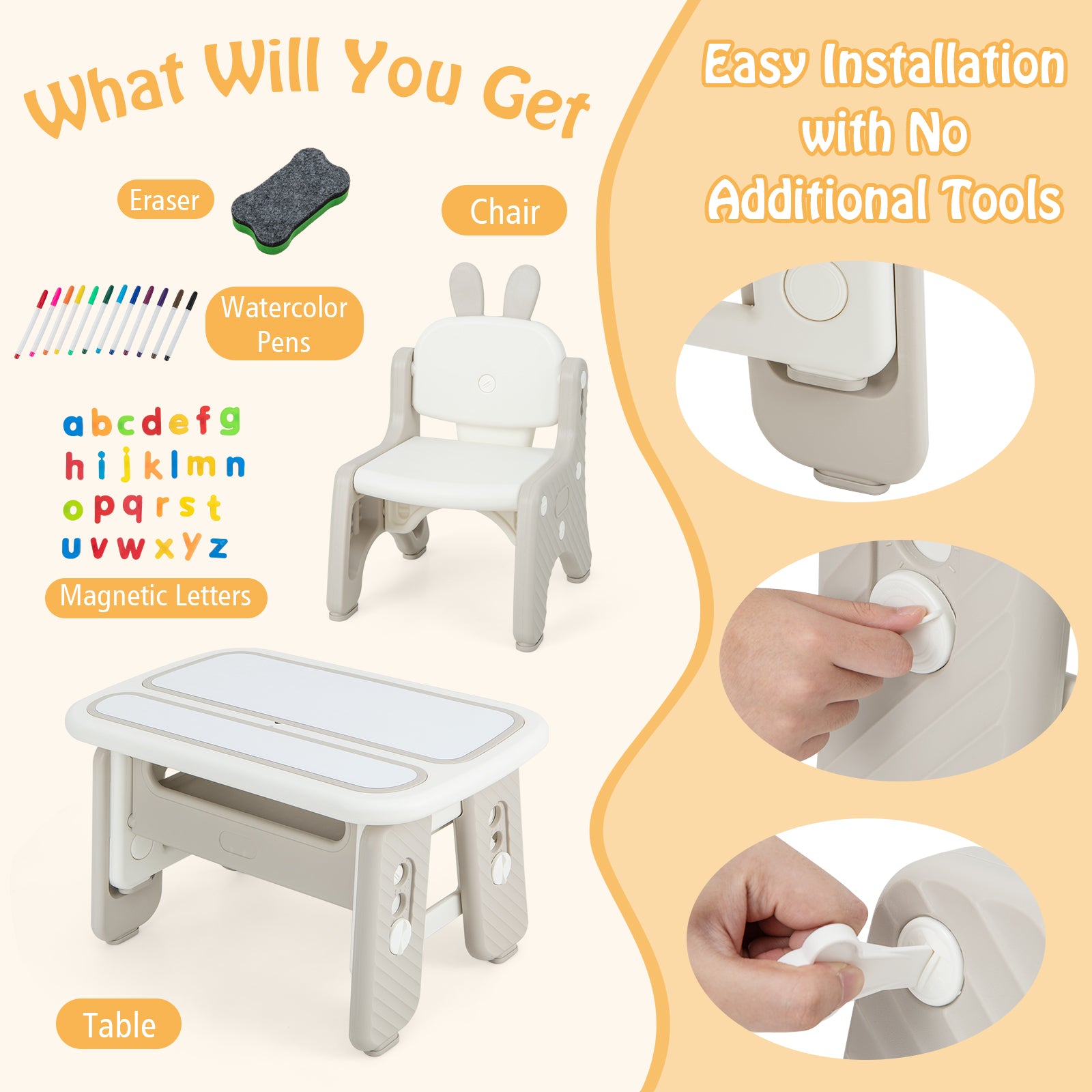 ● Multi-Use Kids Table and Chair Set: This kids table and chair set creates a comfortable space for multiple activities such as eating learning playing and drawing. It will be a great addition to various occasions including play room kids bedroom kindergarten daycare etc. What you will get: 1 x chair 1 x table 1 x eraser 12 x watercolor pens 26 x magnetic letters.
