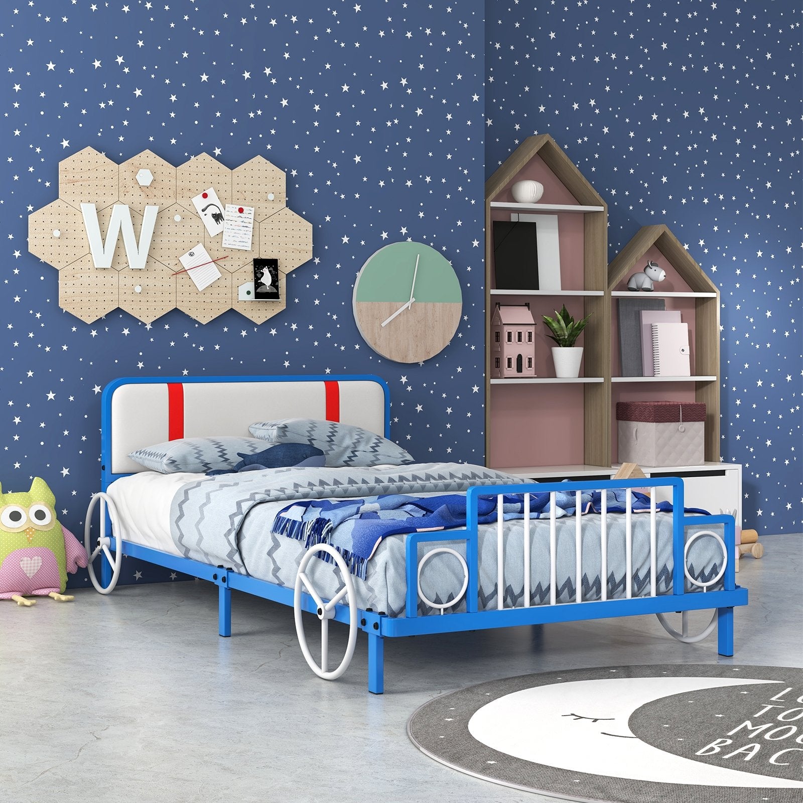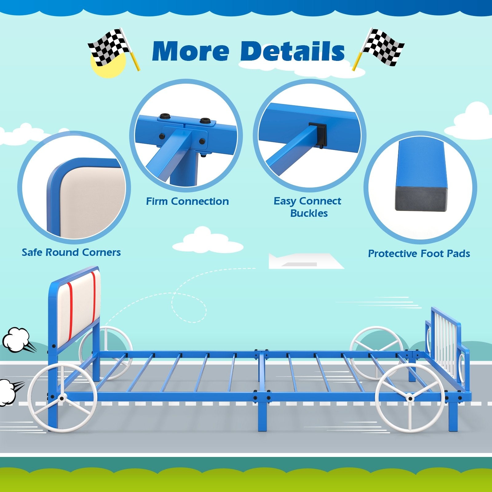 Twin Size Kids Bed Frame Car Shaped Metal Platform Bed with Upholstered Headboard