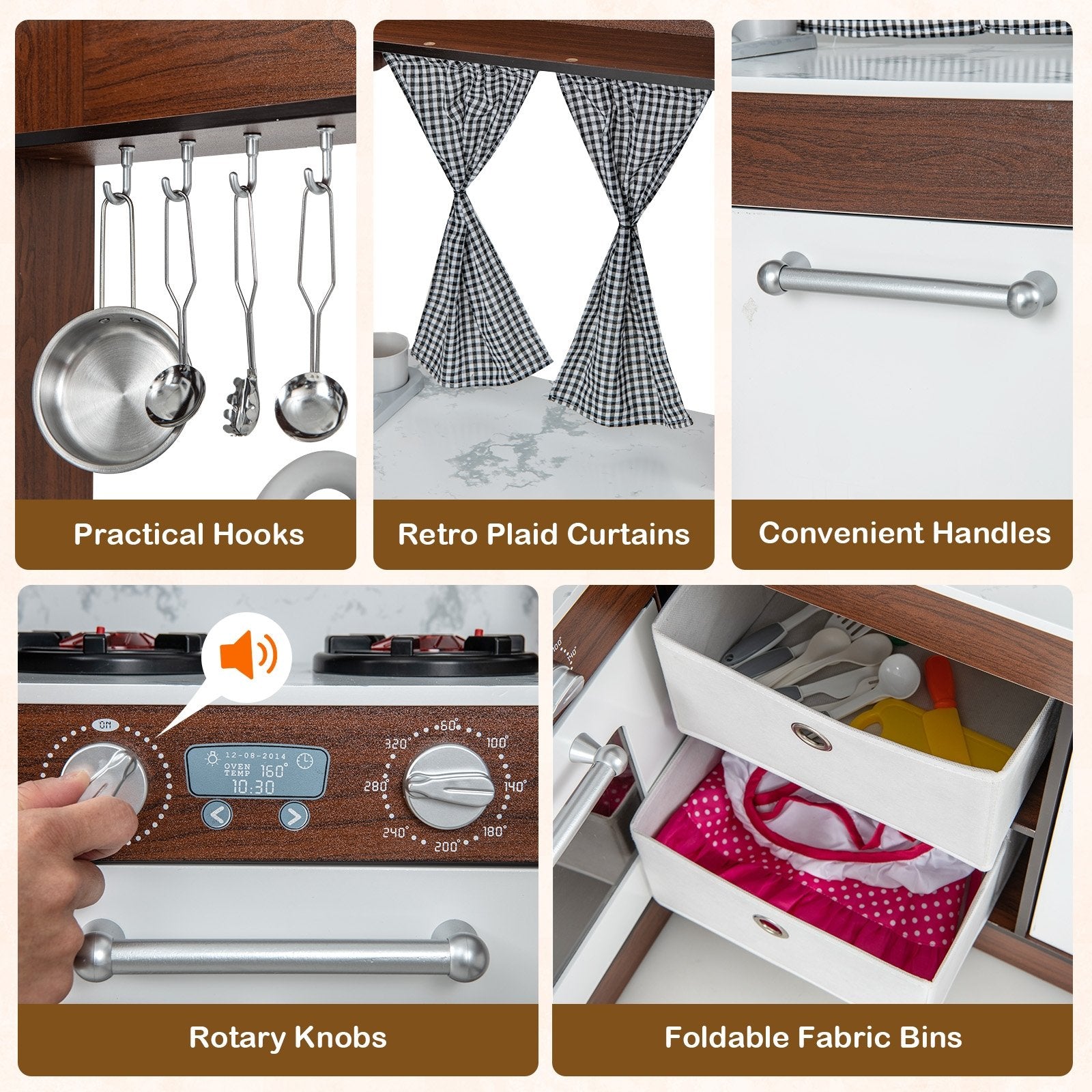 ● Realistic Light and Sound Effects: This wooden corner play kitchen boasts realistic light and sound effects on the range hood and stoves. Thus children are able to enjoy excitement while preparing their imaginary culinary masterpieces with a touch of authenticity.